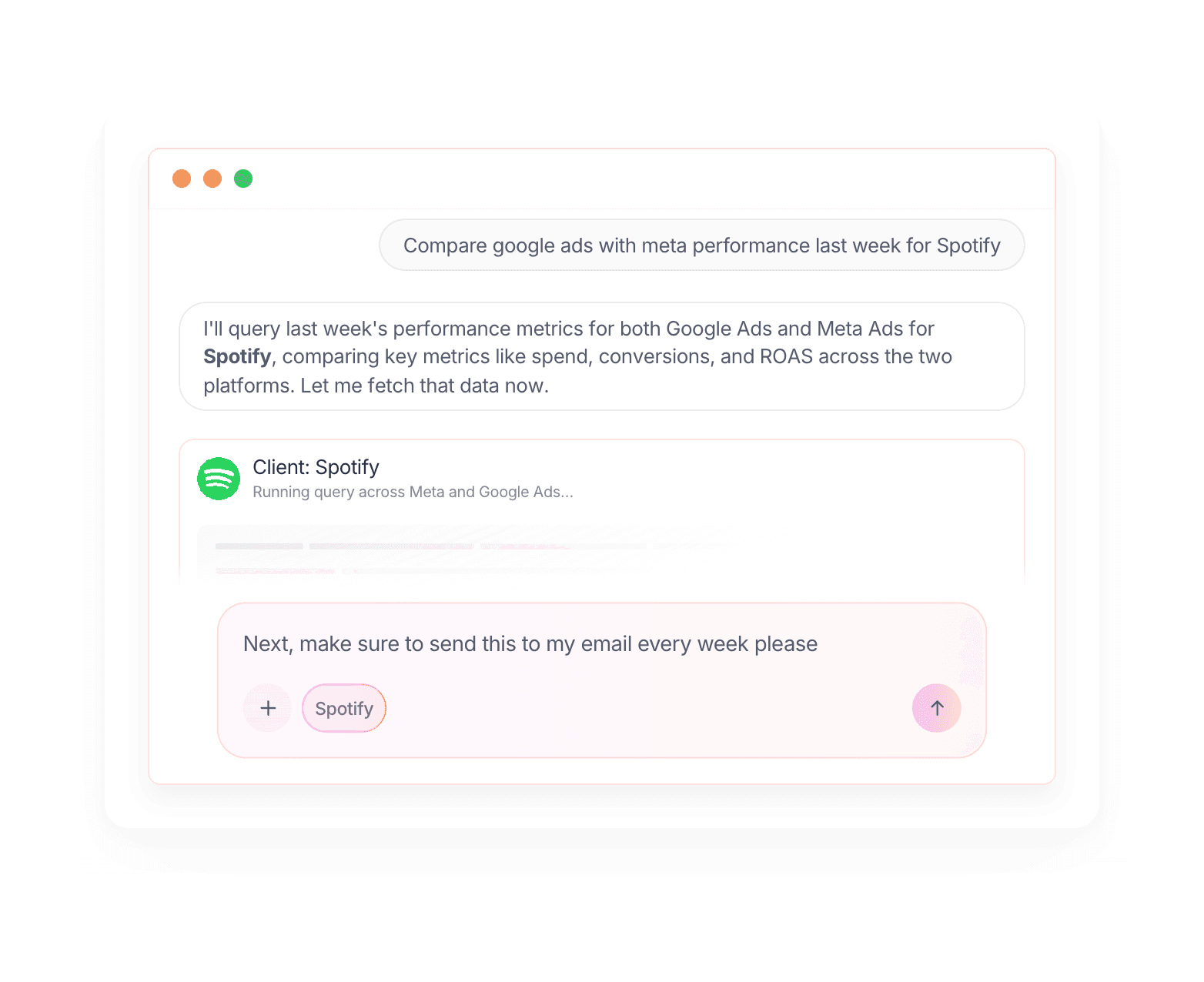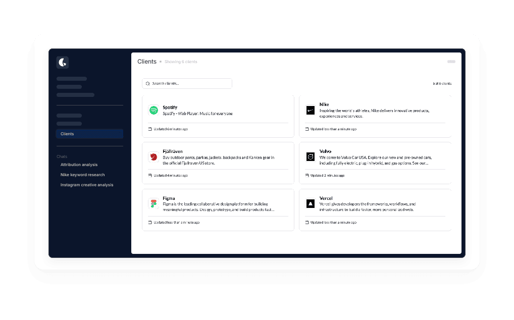 Work inside dedicated client spaces with persistent memory. Context, goals, definitions, and history are never lost.