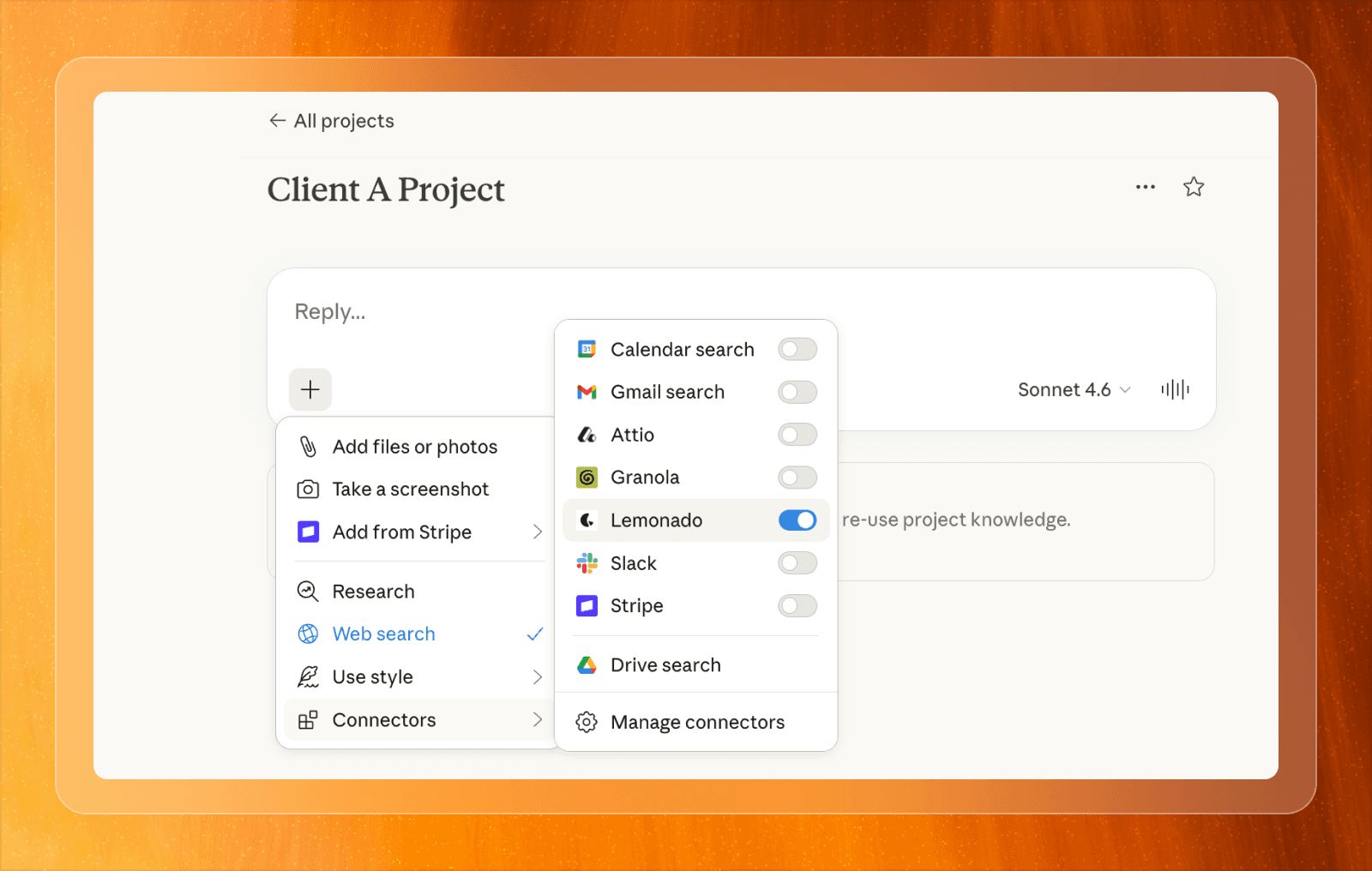 When Lemonado is enabled inside a Project, it remains available across chats in that Project, and Claude can combine: