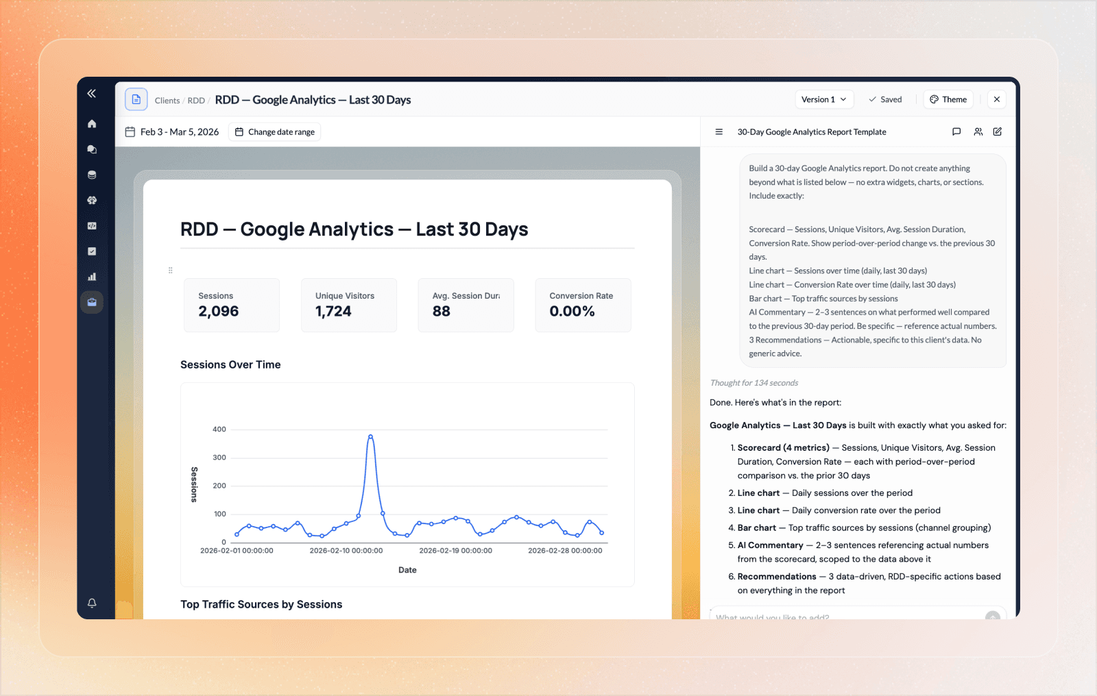 Each client gets their own dedicated workspace, similar to Projects in Claude or ChatGPT. It's where you store everything related to that account — data, context, goals, reporting rules, and definitions — and where you access all of your work for that client: chat, dashboards, reports, and soon, AI agents.